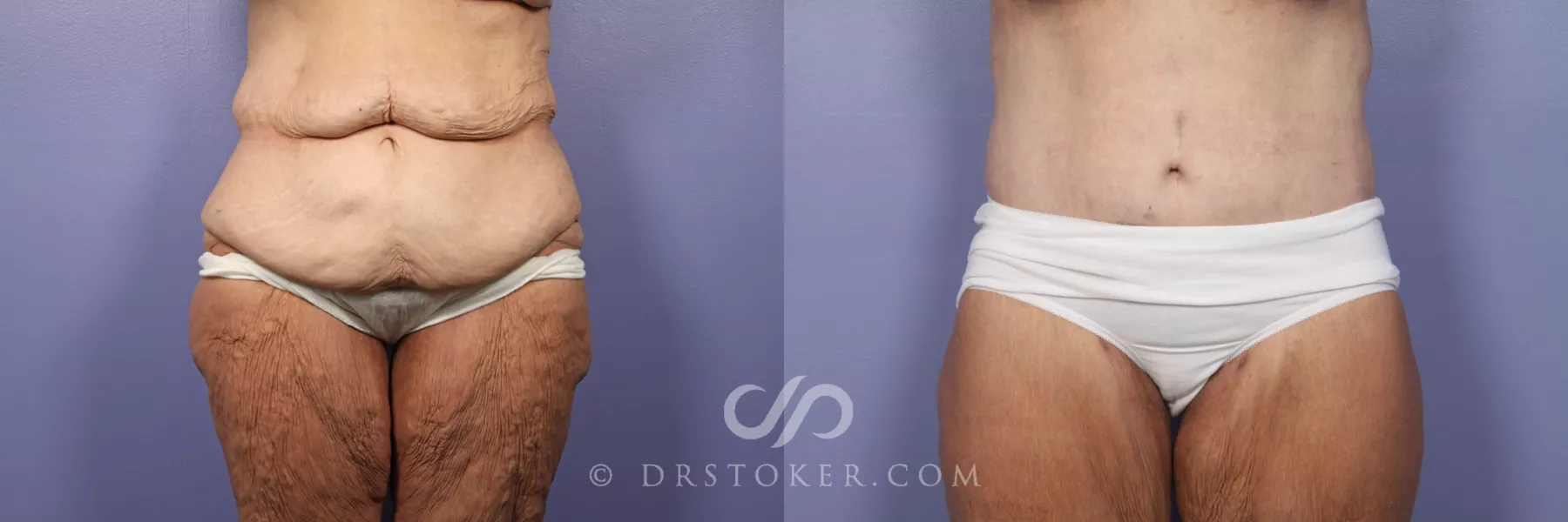 This 64-year-old woman lost over 100 pounds following gastric bypass. She also exercises every day, but was unable to tighten her skin. In two stages, Dr. Stoker performed a tummy tuck, buttocks lift, breast lift and liposuction. She is shown here before and four weeks after her second stage surgery.