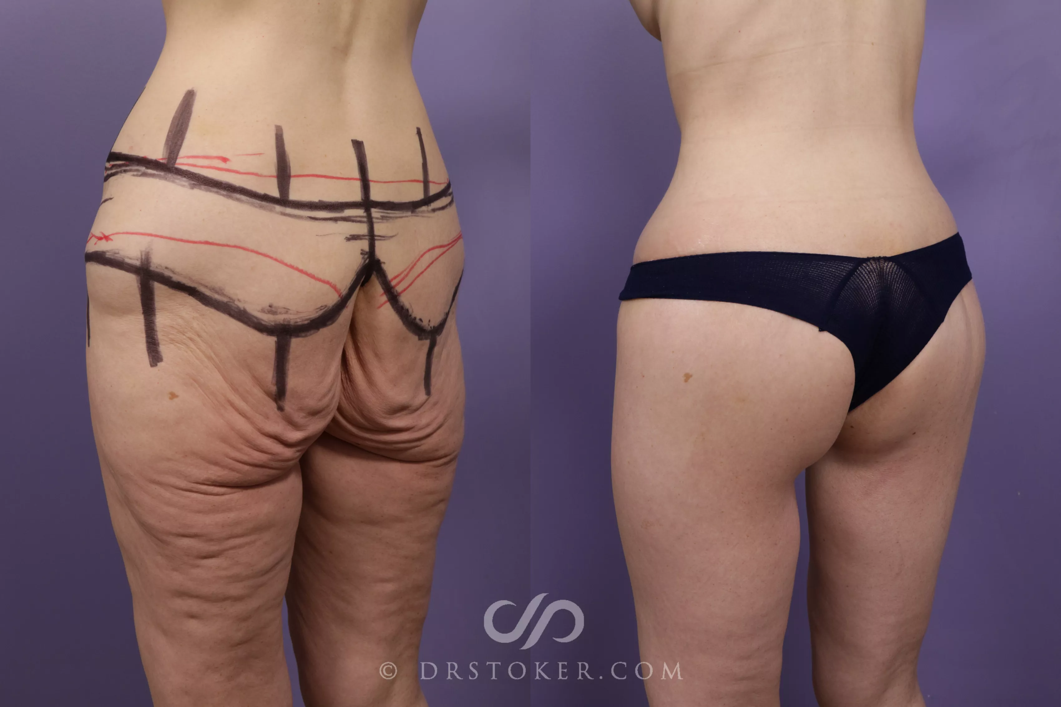We have a 46-year-old patient who underwent a significant weight loss through diet and exercise, which left her with laxity in her abdomen and thighs in addition to cellulite. We wanted to give her a full-body rejuvenation treatment comprised of a circumferential body lift including a buttock lift, lateral thigh lift, abdominoplasty, and pubic lift, not only to restore the elasticity but to improve her overall body contour.