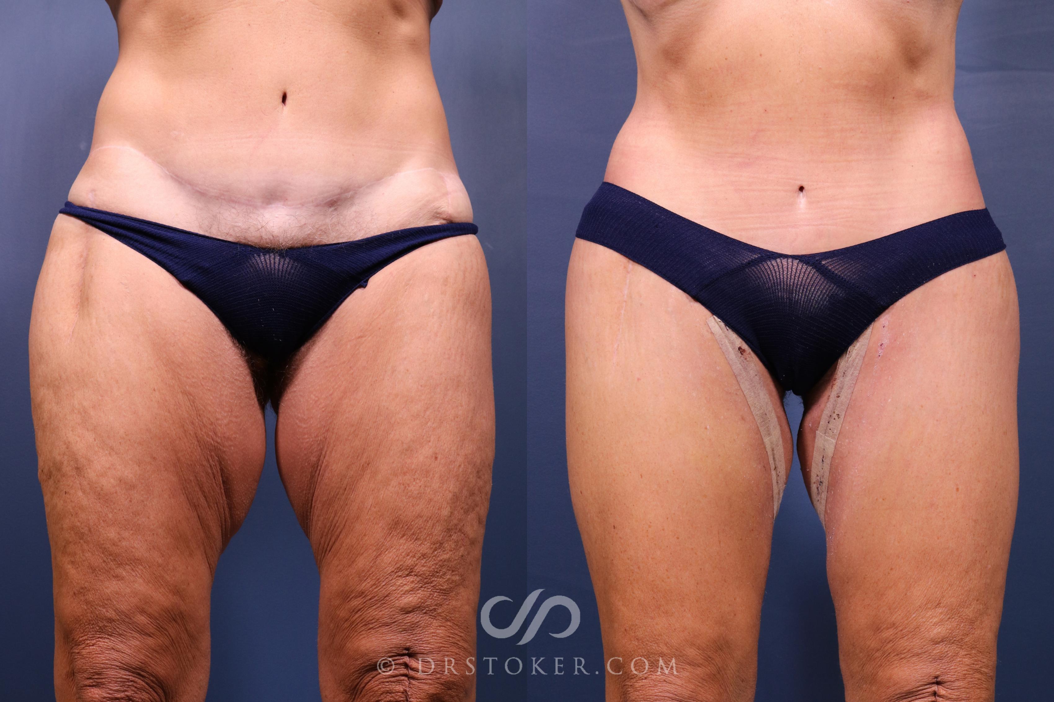 Her surgical plan included Dr. David Stoker’s Bikini Body Lift™, a revision circumferential body lift tailored for difficult cases, as well as a vertical medial thigh lift. The operation targeted the entire lower torso, smoothed the buttocks, and tightened the inner thighs. Liposuction provided further contouring through removal of excess fat from her thighs and knees. Thoughtful placement of incisions allowed for minimal swelling and lines that are easily concealed in clothing or swimwear. At only 13 days postoperatively, her photos demonstrate noticeable skin tightening, refined curves, and discreet, low incision lines. She continues to heal and has reported early satisfaction with her results.