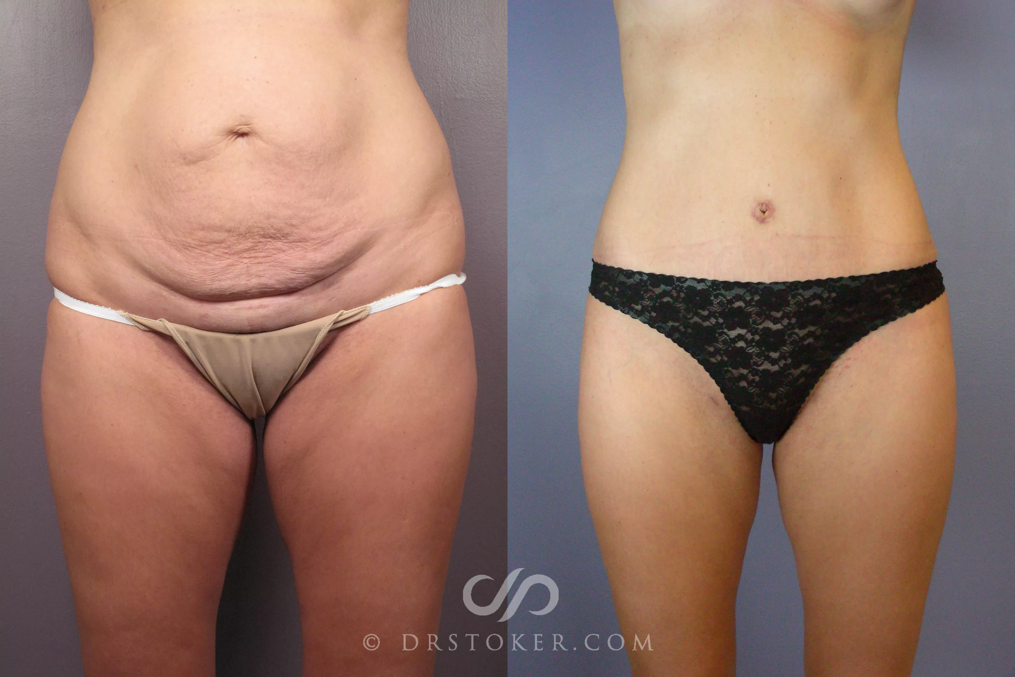 This 36-year-old mother desired an improved appearance of her abdomen after she was done having children. Dr. Stoker performed a tummy tuck and power-assisted liposuction to achieve her goals. She is shown before and ten weeks following her surgery.
