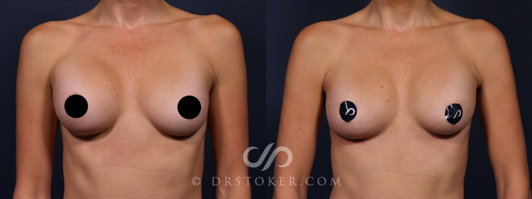 During surgery, Dr. David Stoker identified a hematoma and significant inflammation within the breast pocket. He performed a capsulectomy to remove the tight fibrous capsule and evacuated residual fluid. The patient’s old breast implants were replaced with a pair sized 100 cc higher on each side to restore symmetry and correct an 80 cc volume difference. A discreet incision beneath each breast allowed for precise adjustments while minimizing visible scarring.