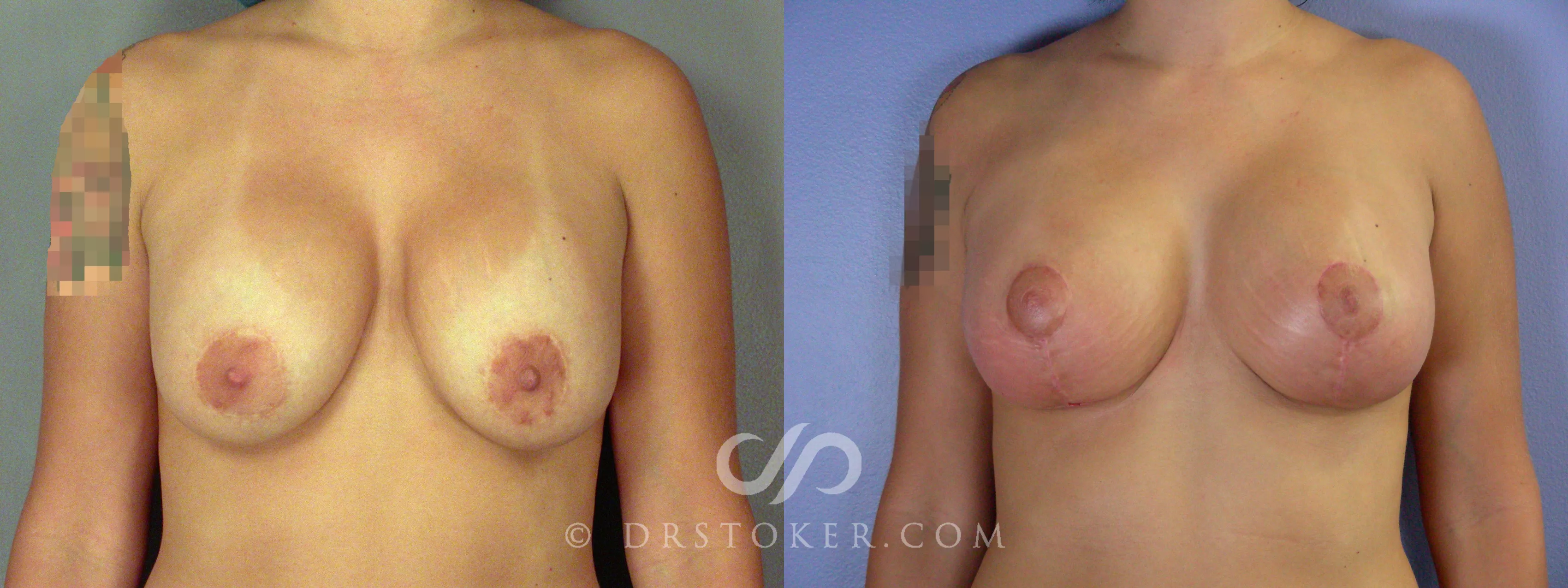 This 34-year-old woman desired corrective breast surgery. After her previous surgery elsewhere, she had dilation of her areolas, excess upper breast fullness and recurrent droopiness. Dr. Stoker performed corrective breast surgery that included a breast lift and replacement of her implants with round, textured mid range profile silicone gel implants of 354cc. She is shown before and one month following surgery, when she is still in the early stage of healing. For patient privacy, her tattoo is obscured in the photographs.