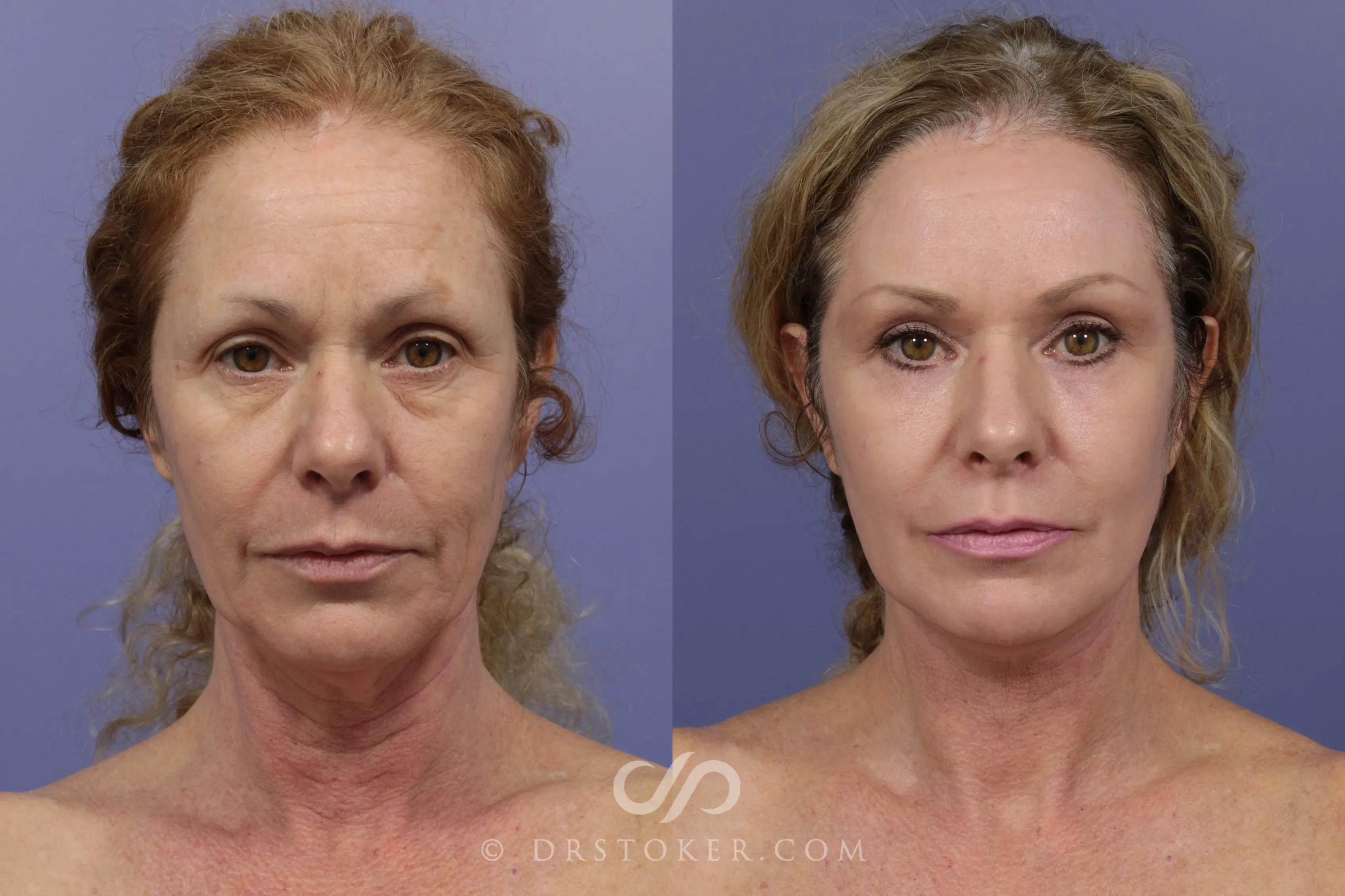 A 53-year-old woman came to us desiring a pan-facial rejuvenation. She had beautiful underlying features, but her skin did not hold up well in the Southern California sun, and she also smoked for a good number of years that accelerated the aging. I performed a Traceless facelift and neck lift, in addition to upper eyelids and deep fractional carbon dioxide laser resurfacing. You will notice the effects were quite transformative. Her neck is spectacularly improved. Her jawline is also dramatically improved, with the jowls being removed and the cheek laxity being removed. Her eyelids, I think, are most impressive. She had shadows under her eyes, and crepiness of the skin, and bags under her eyes; those were 100% resolved with this procedure. Her eyes now sparkle because the extra skin blocking light from getting into her eyes has been tightened and removed. The final effect in the quality of her skin, all the way from her brow to our eyelids, her cheeks, chin, and neck, every single bit of it has been rejuvenated in a dramatic way that really has enhanced her life. Yet, no one would say she appears as though she's had a ton of plastic surgery procedures. She looks great.