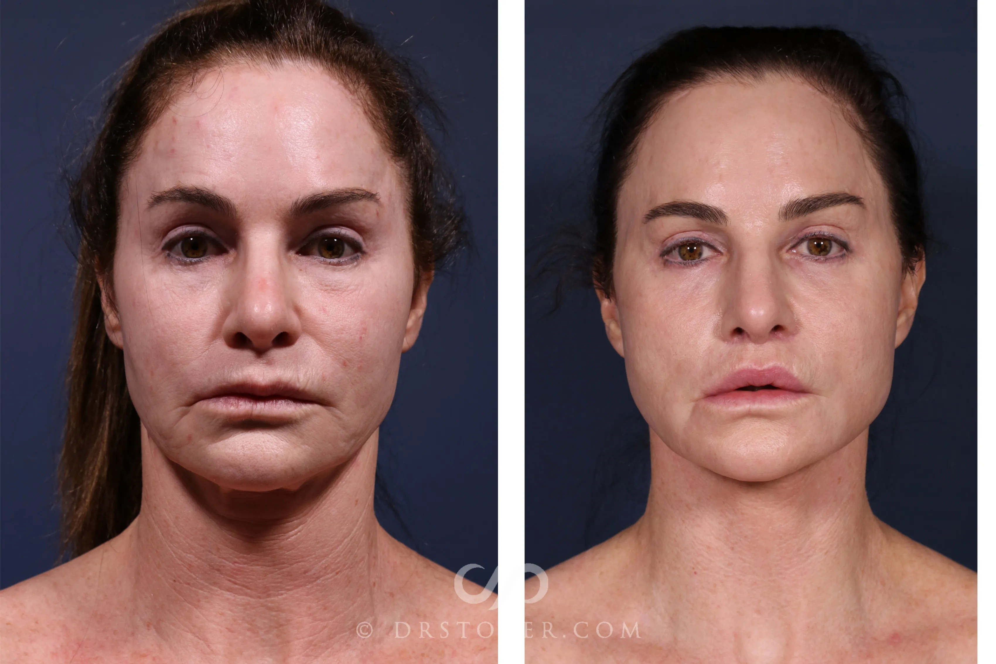At 54, this patient sought facial rejuvenation after previously undergoing facelift, eyelid surgery, and a lip lift about a decade ago. Over time, she noticed new sagging along her jawline, the return of neck laxity, deepening lines, and changes in her lip shape. Wishing to address these concerns, she pursued elective procedures including a traceless deep plane facelift, deep plane neck lift, upper lip lift, and fractional CO2 laser skin resurfacing.